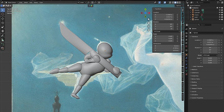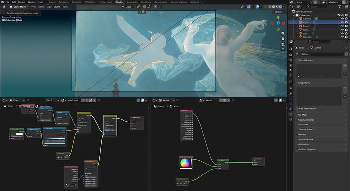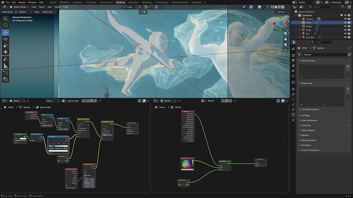 I’ve been a little rusty with Blender lately. I wanted to find a good way to jump back in, so I’m doing a painting study by creating a little scene. I found this painting where I loved the lighting - A Eunuch’s Dream. I mainly wanted to recreate those smoke figures in the light, but I’m not interested in a one-to-one recreation. I realized there is no way I can finish this in a few hours, so I focused mainly on one area that was my favorite- the baby with a knife!