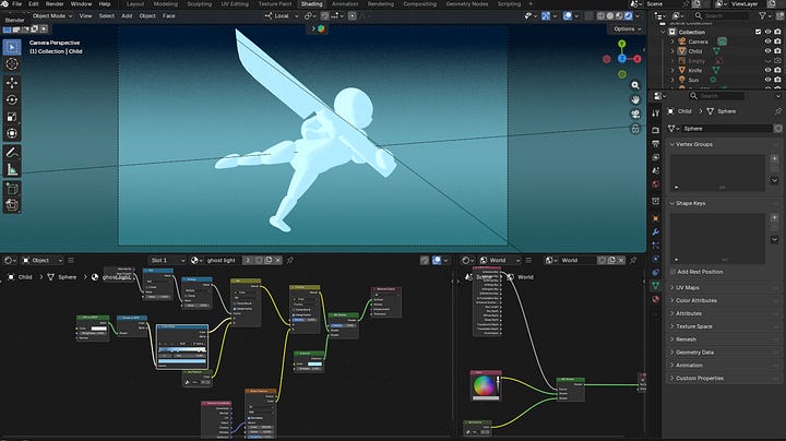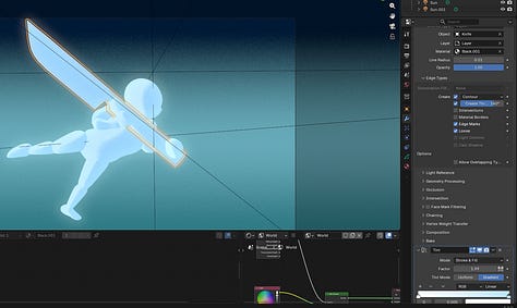Then I added a grease pencil > Object Line Art to make the glowing outline the character has. I also drew a little blood on the knife, which looks silly as hell, but whatever. Then I added a point light to make that little shine on the tip, which I’m still working on.